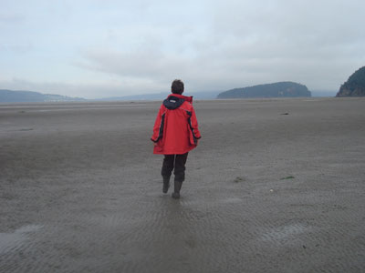- Seth, Regina, Britt, and Lisa (and canine friends Tagg and Whit)(left to right) walk across the tidal flats.