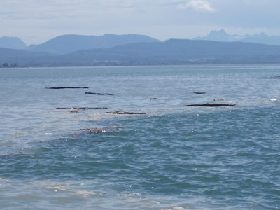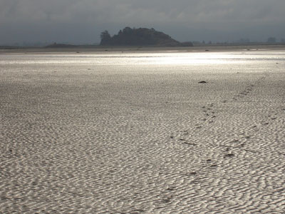 - Tidal flats at low tide with ponded water owing to strong south-westerly winds.