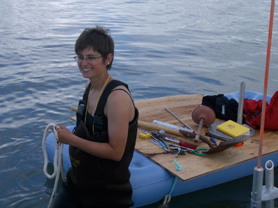 - Vera holding our makeshift raft with parts during instrument deployment.